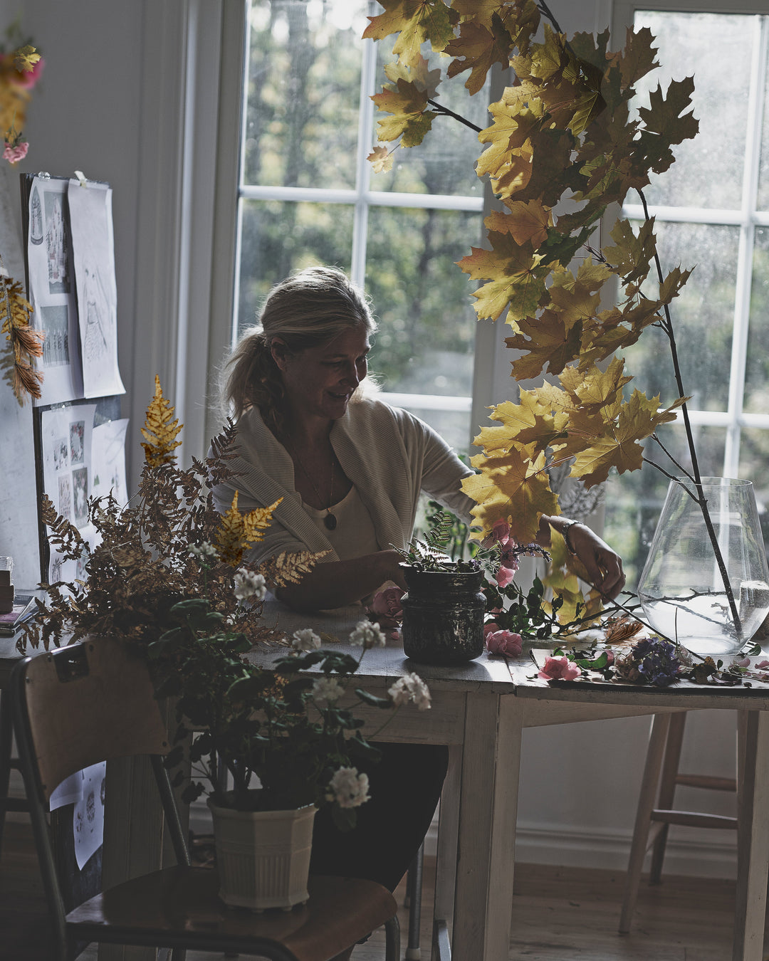 My botanical art began with my children and their pockets full of petals and leaves. Back at home, they would arrange their nature treasures and then, I began to create elaborate scenes in the center of our dinner table. The wonder reflected in their faces inspired me to keep going.